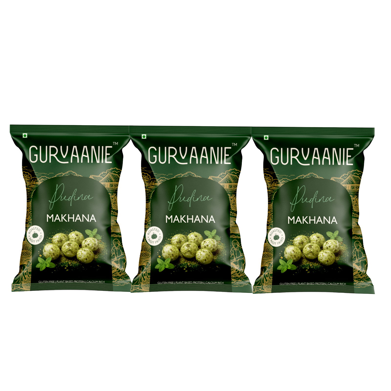 Gurvaanie Pudina (Mint) Roasted Makhana | Plant Based Protein | Rich In Protein | Fresh & Refreshing Makhana (21g x 3)