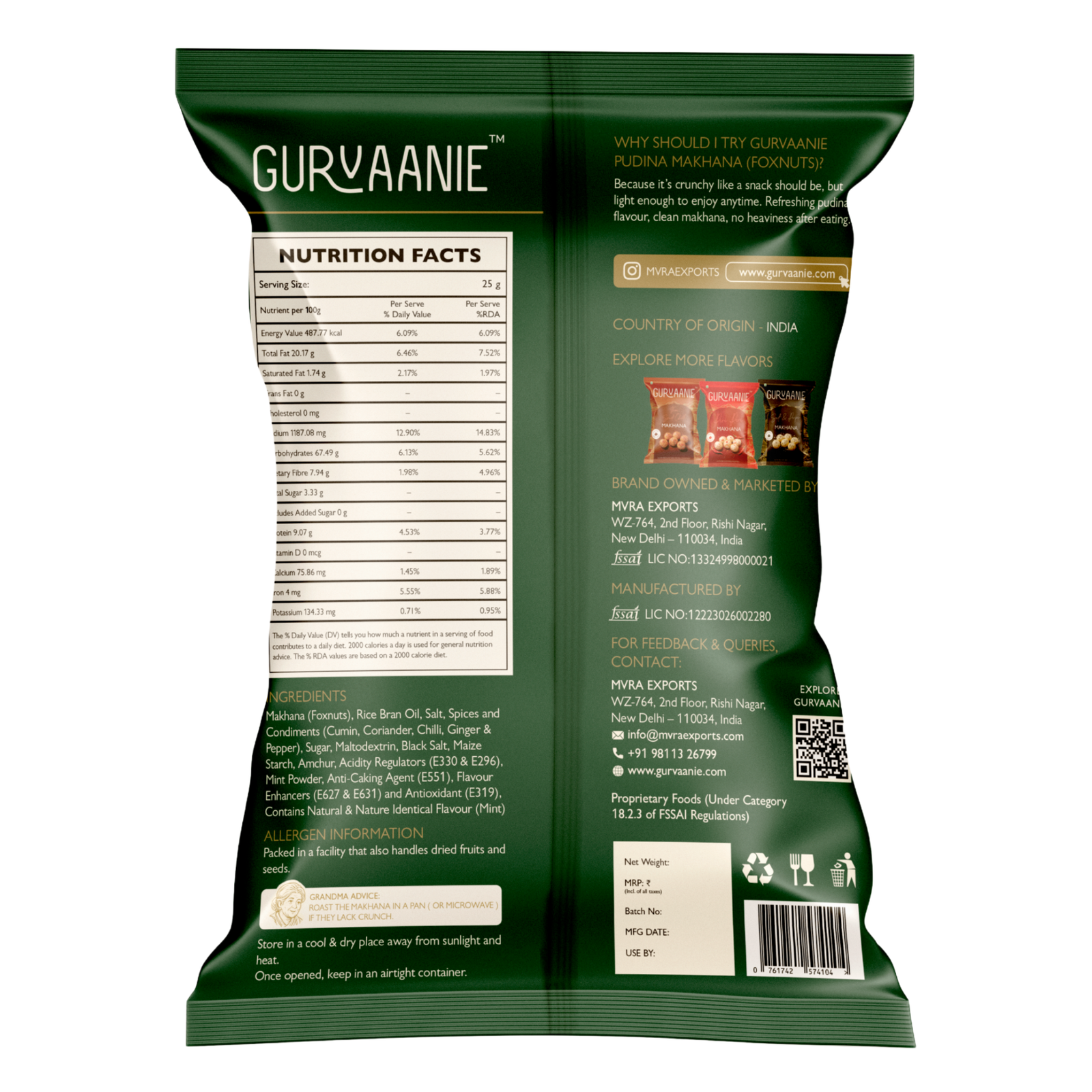 | Product Name | Gurvaanie Mint (Pudina) Flavoured Makhana (Foxnuts). A Light & Crunchy Healthy Indian Snack |