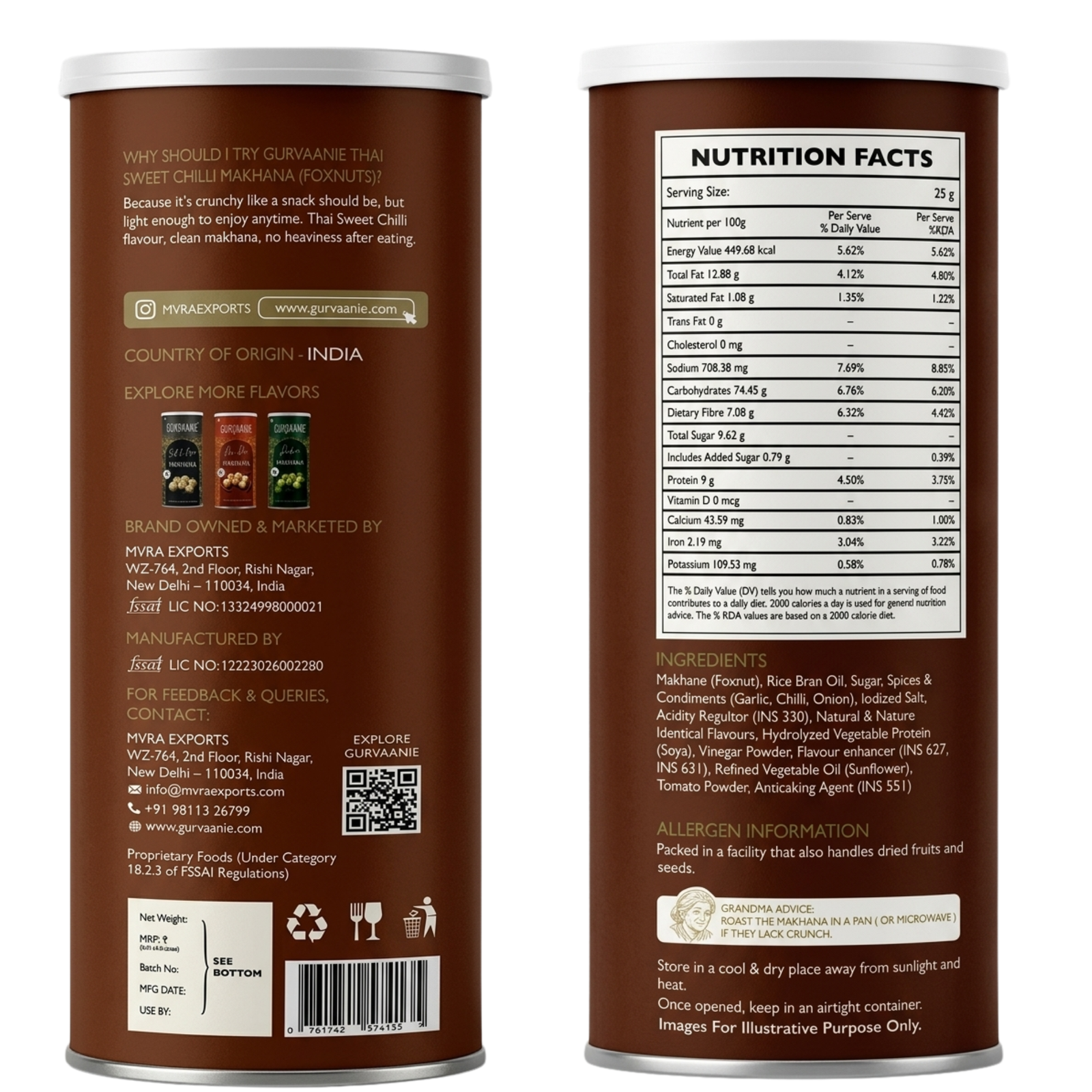 | Product Name | Gurvaanie Mint Thai Sweet Chilli Flavoured Makhana (Foxnuts). A Light & Crunchy Healthy Indian Snack |
