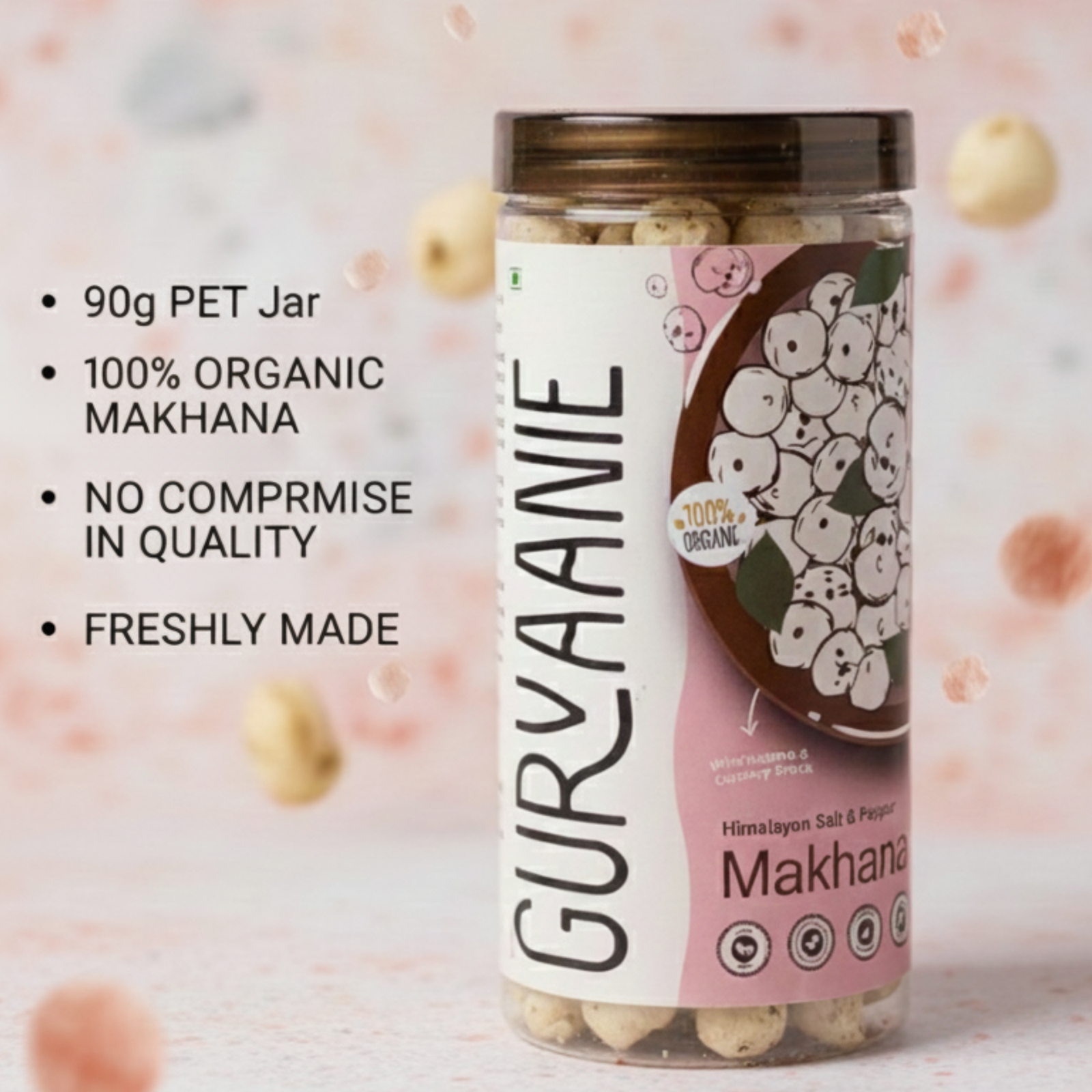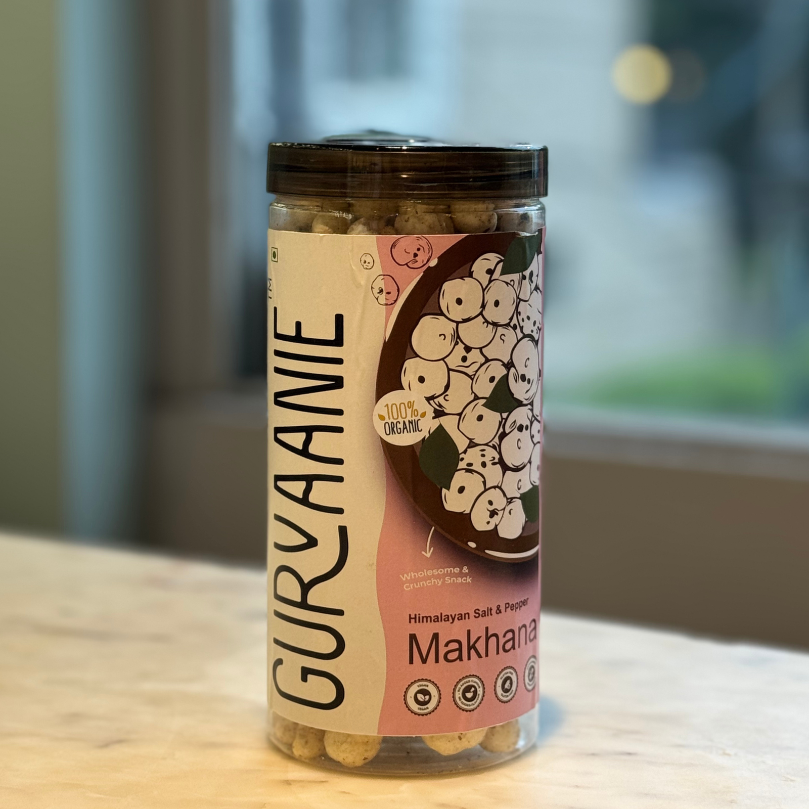 Product Name Gurvaanie Himalayan Salted & Pepper Flavoured Makhana (Foxnuts). A Light & Crunchy Healthy Indian Snack