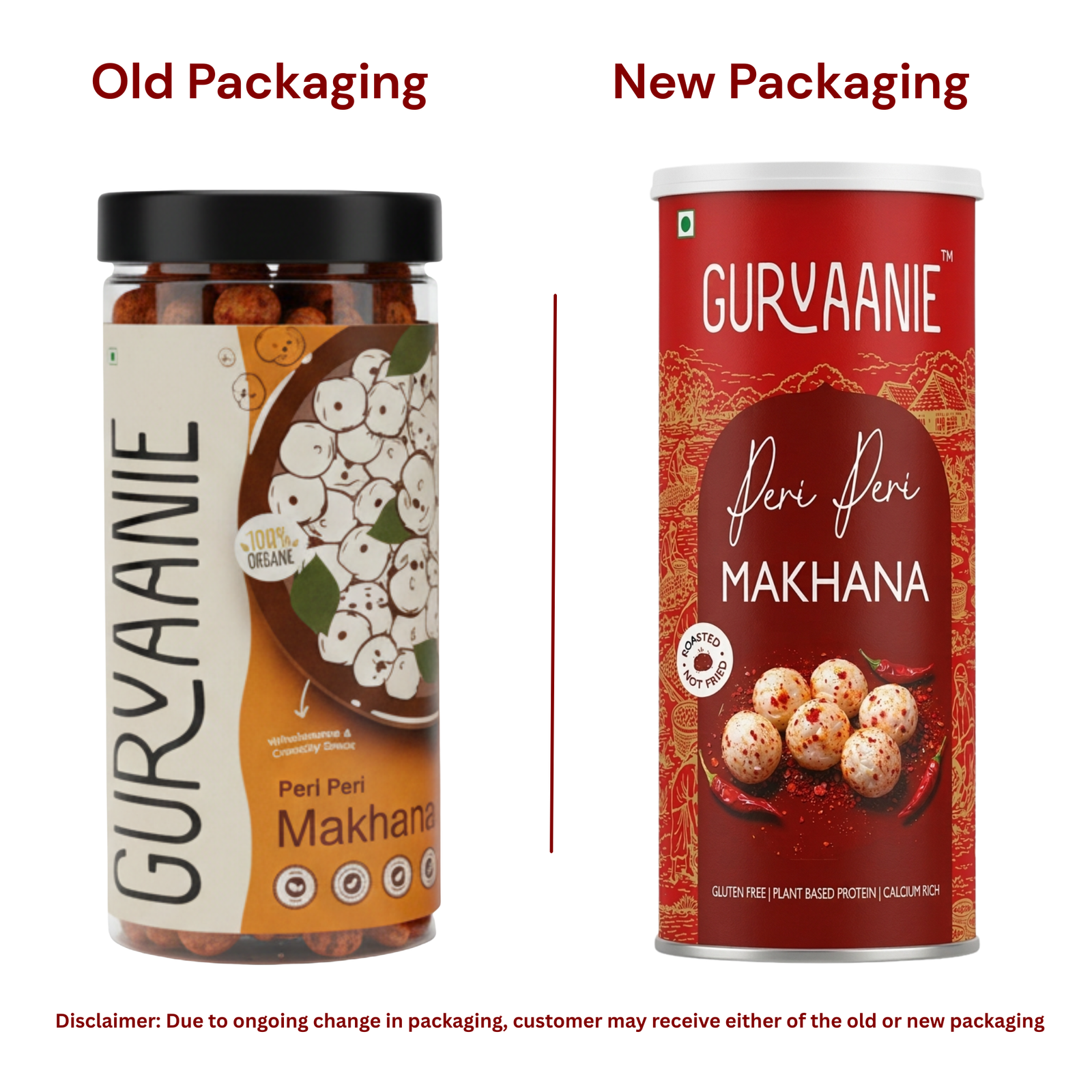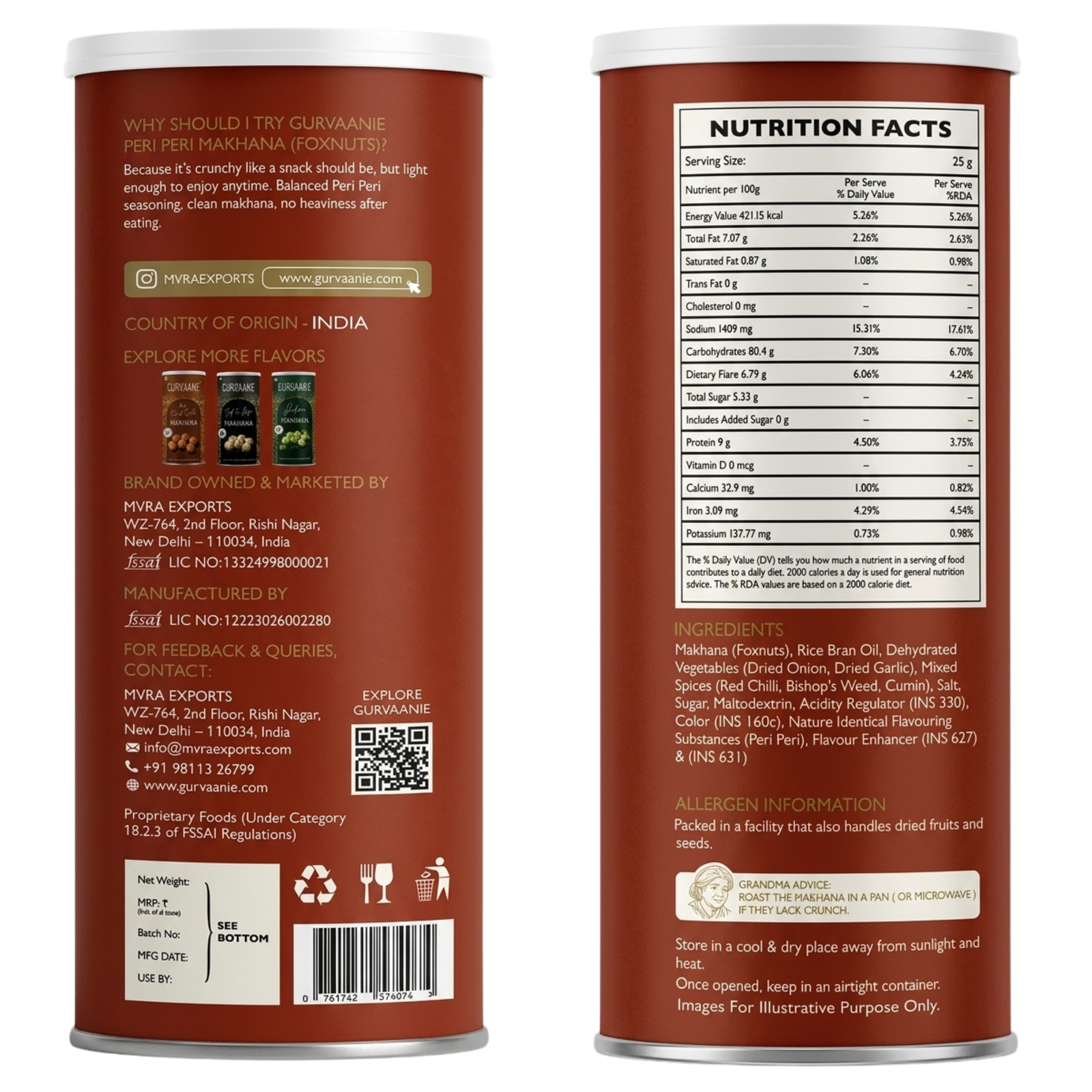 | Product Name | Gurvaanie Peri Peri Flavoured Makhana (Foxnuts). A Light & Crunchy Healthy Indian Snack |